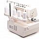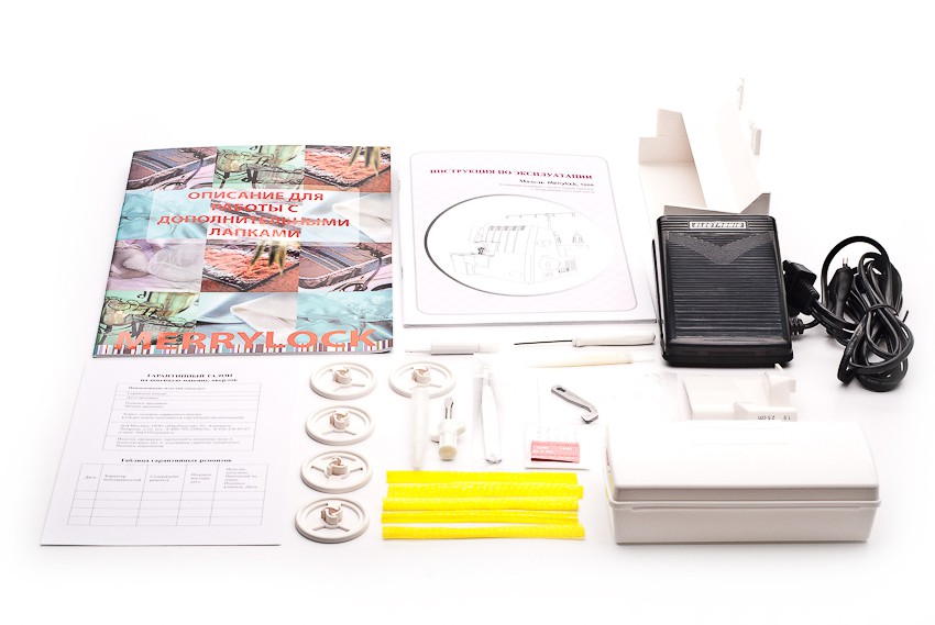 В комплекте Лапка, Пинцет, Катушкодержатели, Сеточки, Щетка для чистки, Набор игл, Отвертка, Ключ, Мусоросборник, Верхний нож, Масленка, Конвертер для 2-ниточных швов, Нитевдеватель, Мягкий чехол
