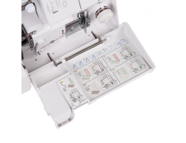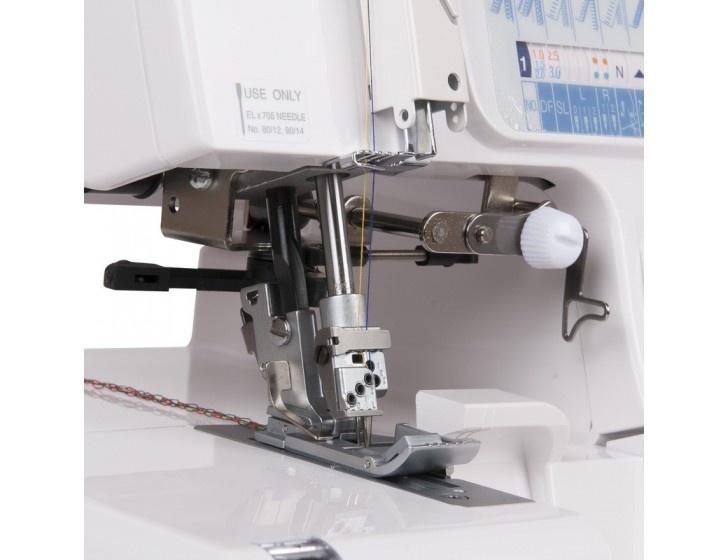 5-и ниточный коверлок. Оверлок + плоскошовная машина. Регулировка давления лапки на ткань, дифференциал. Автоматическое натяжение нитей.