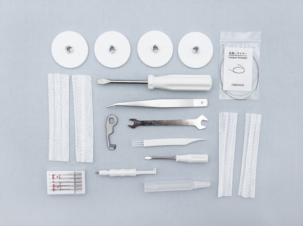 В комплекте Мягкий чехол Отвертка большая Отвертка малая Пинцет Гаечный ключ Держатель иглы/устройство для переключателя на двухниточный шов Масло Набор игл Запасной верхний нож Держатели катушки, 4 шт. Сетки для катушек, 4 шт. Щеточка Нитевдеватель петлителей Мусоросборник Коробка для хранения аксессуаров