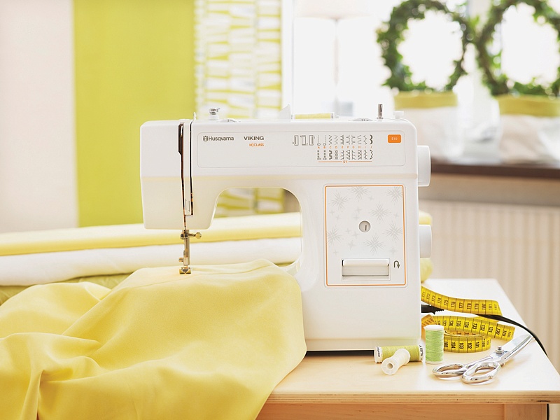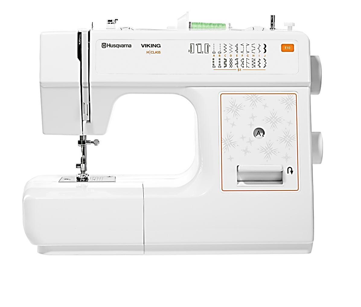 Husqvarna Viking E10 - прекрасная швейная машина для начинающих. Вертикальный челнок, 18 строчек, Петля-полуавтомат, Освещение, 5 лапок в комплекте. Отличное качество строчки и скорость шитья.
