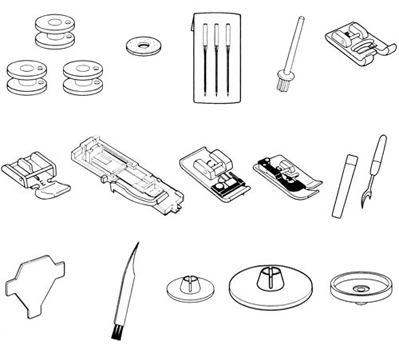 В комплекте Универсальная лапка, Лапка для молнии, Оверлочная лапка, Лапка для потайного шва, Прозрачная лапка для декоративных строчек, Лапка для петли-автомат, Шпульки (4 шт.), Игл, Кисточка от пыли, Вспарыватель, Отвёртка для машины, Держатель для шпульки (большой, маленький), Чехол мягкий
