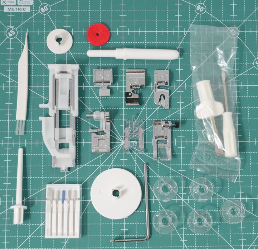 В комплекте Универсальная лапка, Лапка для молнии, Лапка для выметывания петли-автомат, Оверлочная лапка, Лапка для потайного шва,Лапка подрубочная, Лапка прозрачная для декоративных строчек, Направитель ткани, Набор шпулек (4 шт.), Набор игл, Вспарыватель, Большая отвёртка, Кисточка, Дополнительная стойка для катушки, Держатель для катушки (большой, маленький),Фетровая прокладка под катушку, Жесткий чехол