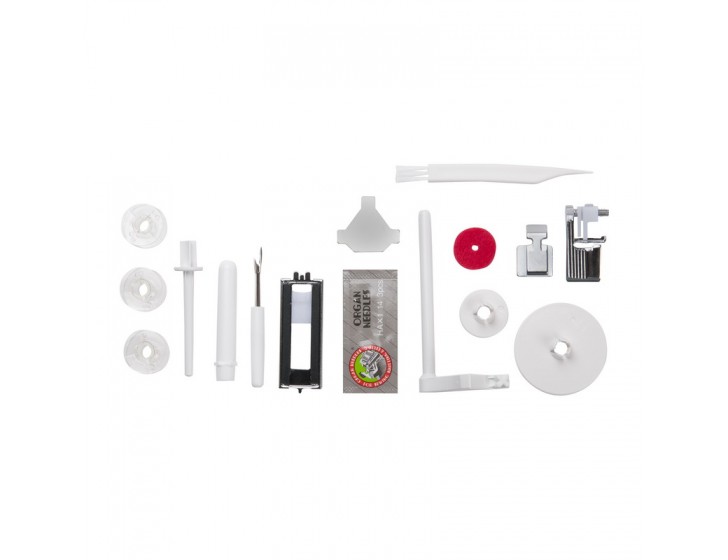 В комплекте Лапка универсальная, Лапка для вшивания молнии, Лапка для полуавтоматической петли, Лапка для потайного шва, Шпульки (4шт.), Набор игл (3), Стойка для катушки, Горизонтальный катушечный стержень, Фетровая прокладка для катушки, Ограничитель для катушек (большой, малый), Вспарыватель, Отвертка-ключ, Щеточка для пыли
