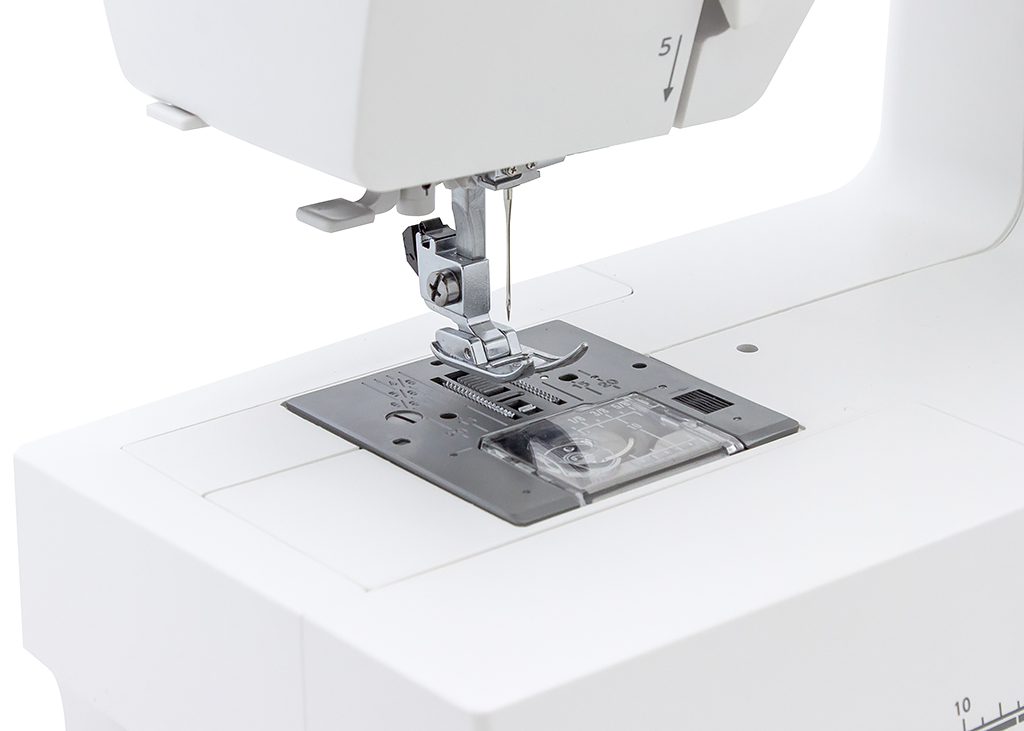 Сантиметровая и дюймовая линейка на корпусе машины позволяет производить измерения не отрываясь от работы, а удобная разметка на игольной пластине поможет точному позиционированию ткани под лапкой и выполнению швов на необходимом расстоянии.