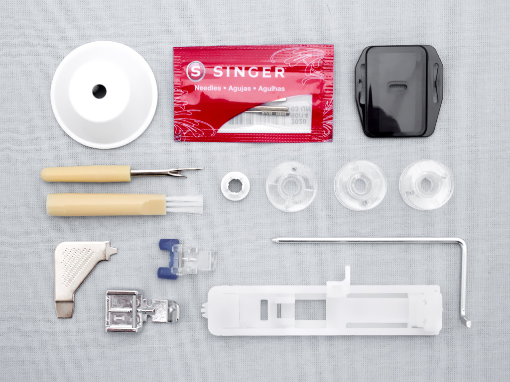 В комплекте Педаль Мягкий чехол Универсальная лапка Лапка для выполнения петли Лапка для пришивания пуговиц Лапка для молнии Пластина для штопки Прижимные диски для катушки Отвертка Шпульки Иглы Распарыватель/Кисточка Направитель для отстрочки